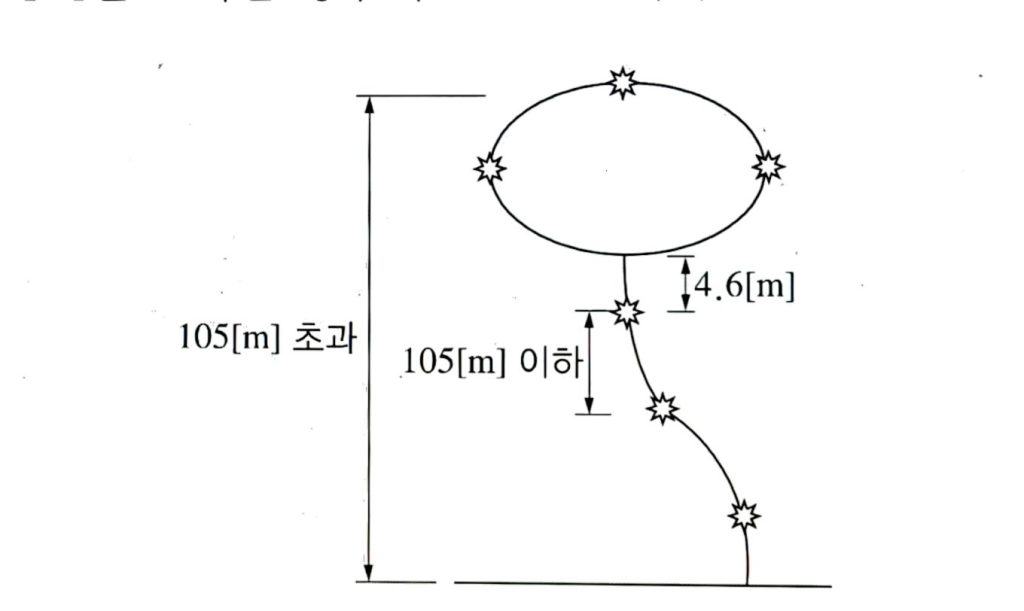 - 전체 높이가 105[m]를 초과할 경우에는 105[m]마다 등간격으로 설치